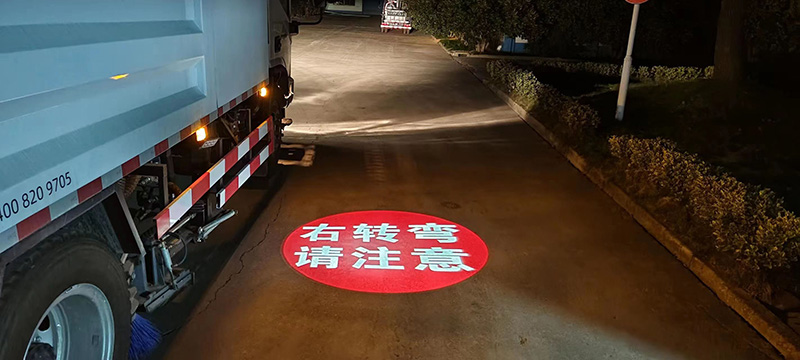 冬天早晨亮的比較晚,十一二月在黃浦區(qū)的部分路段上,路上的非機(jī)動車和行人在路口發(fā)現(xiàn)了一個新事物,很多垃圾清運車和渣土車輛在右轉(zhuǎn)時,在車輛右側(cè)的右轉(zhuǎn)盲區(qū)區(qū)域內(nèi),都有“危險區(qū)域”的紅底白字或紅色箭頭的安全警示投影燈在地面上,在視線不好的傍晚和夜間更是特別的清晰。&